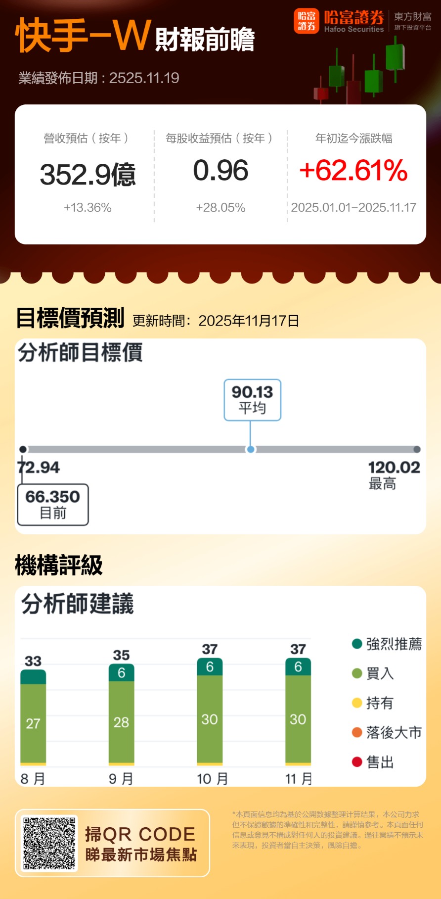 快手-W将于北京时间11月19日发布财报,2025Q3预计实现营收352.9亿元,同比增加13.36%;预期每股收益0.96元,同比增加28.05%。