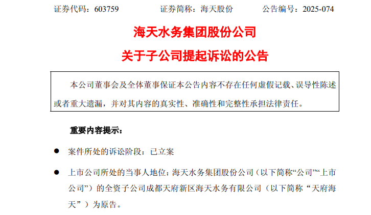 公告显示,海天股份与天府新区的纠纷源于相关污水处理项目特许经营权解除的赔偿问题。